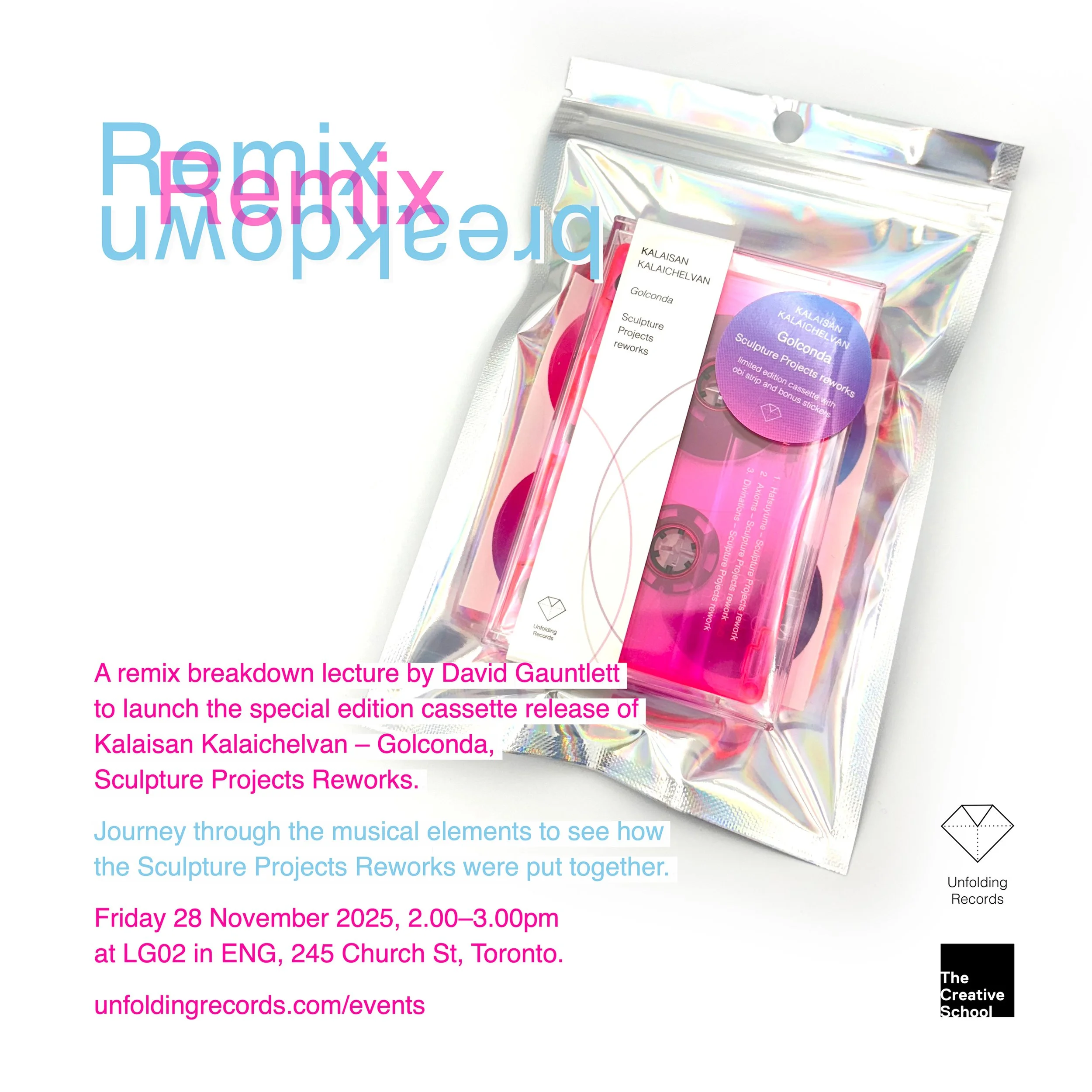 And these are being released on beautiful cassettes! So you are warmly invited to the cassette launch of the Kalaisan Kalaichelvan – Golconda: Sculpture Projects Reworks, on Friday 28 November 2025, 2.00–3.00pm at LG02 in the George Vari Engineering and Computing building on TMU campus, at 245 Church Street.